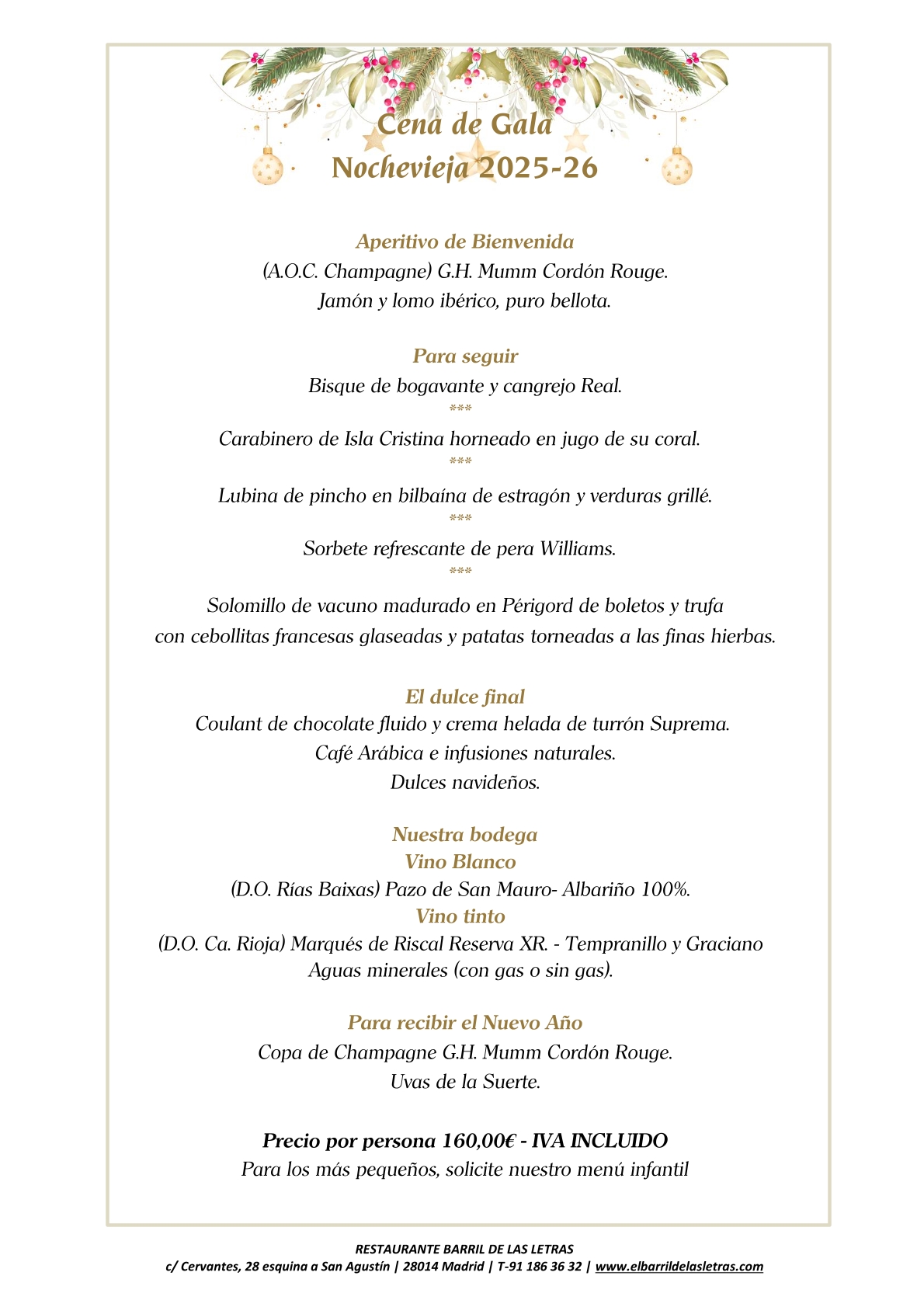 - El menú incluye las bebidas desde el inicio de la comida/cena (entrantes) hasta fin de la misma (postres).